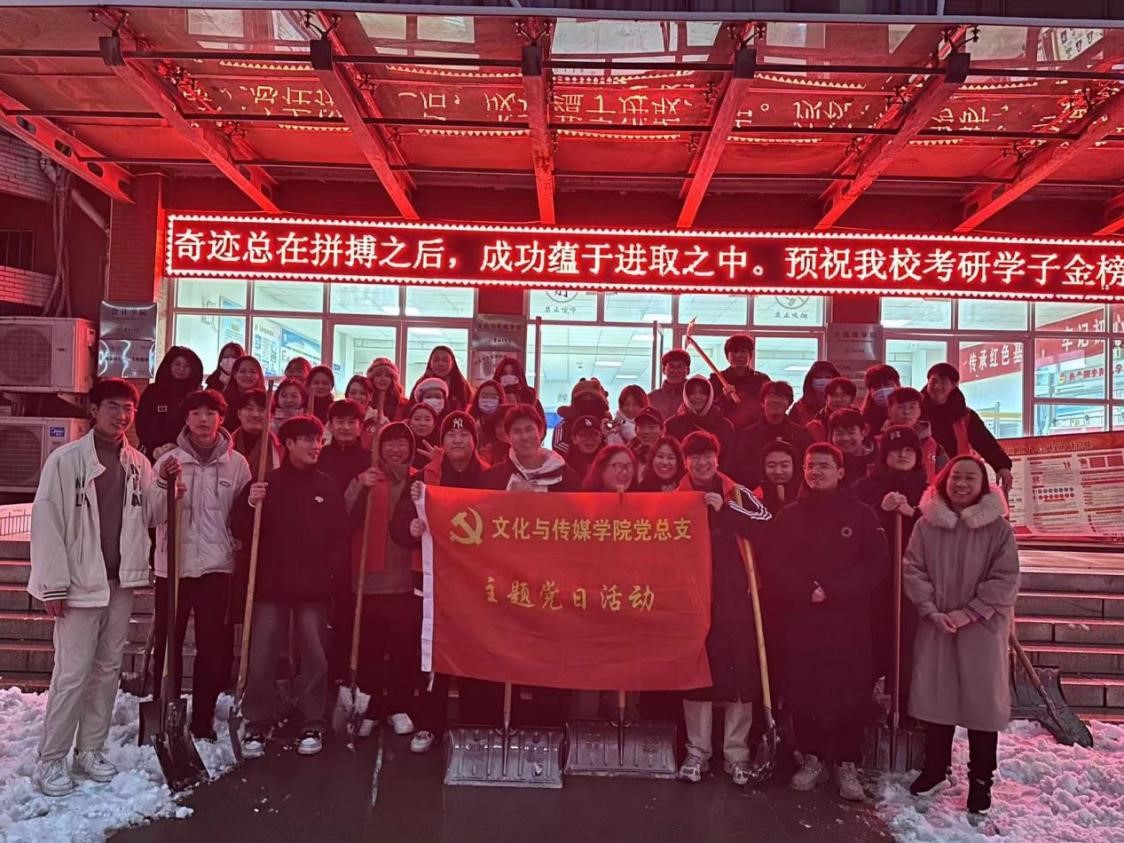 为保障师生出行安全,12月14日下午,文化与传媒公司各党支部共组织40余名师生党员联合开展“先锋模范我引领”积雪清除主题党日活动。