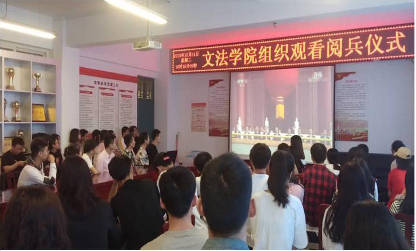 上午10点,随着庄严的国歌声响起,全体师生肃穆起立,不少同学情不自禁共唱国歌。随后,观看盛大的阅兵式,雄浑壮丽的进行曲、铿锵有力的步伐、先进精良的武器装备,无不让师生热血沸腾、激情澎湃,现场不时响起阵阵掌声.气势恢宏的阅兵仪式让老师同学们激动不已,深切感受到了祖国的强大、生活的美好,进一步增强了民族自信心和自豪感。