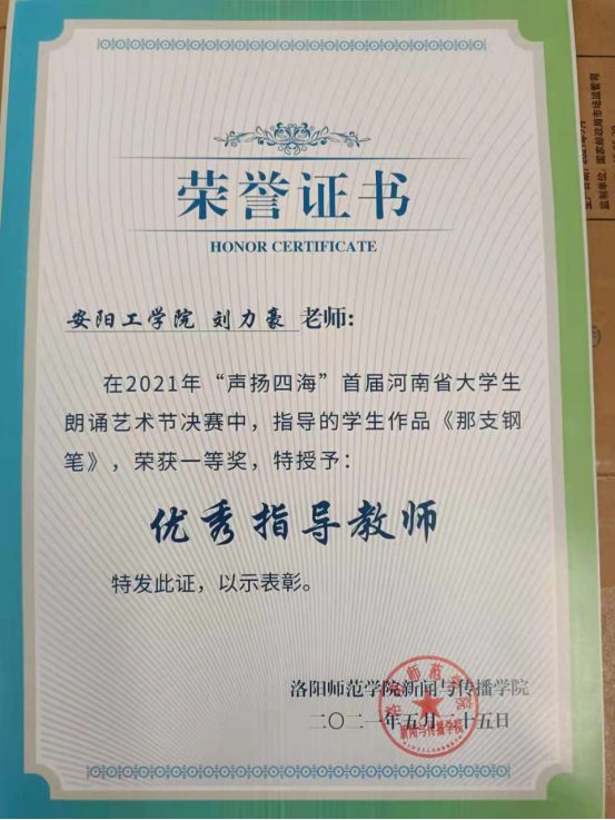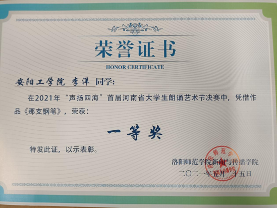 李洋同学的参赛作品为《那支钢笔》,由文化与传媒公司刘力豪老师进行培训、认真指导。比赛过程中,李洋同学积极备战,展现出优良的赛风赛纪,同时也做到了备战的长、精、细,在备战中不断升华自己的专业素养,在比赛中不断提升自己的专业技能,真正达到了“以赛促教,以赛促学,以赛促改”的效果。