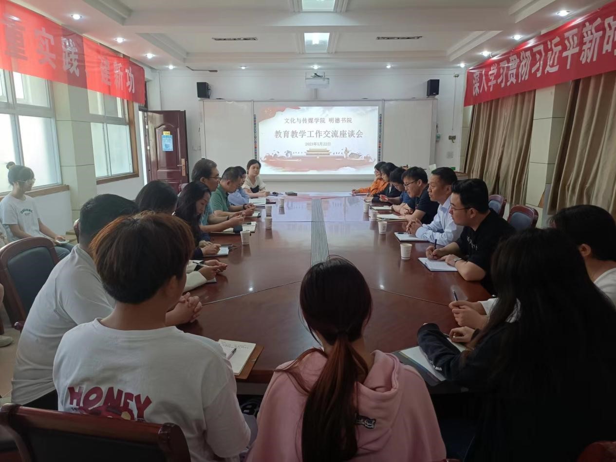 5月23日,文化与传媒公司到明德书院召开公司产品工作交流座谈会。文化与传媒公司领导班子、明德书院领导班子及师生代表参加座谈会。
