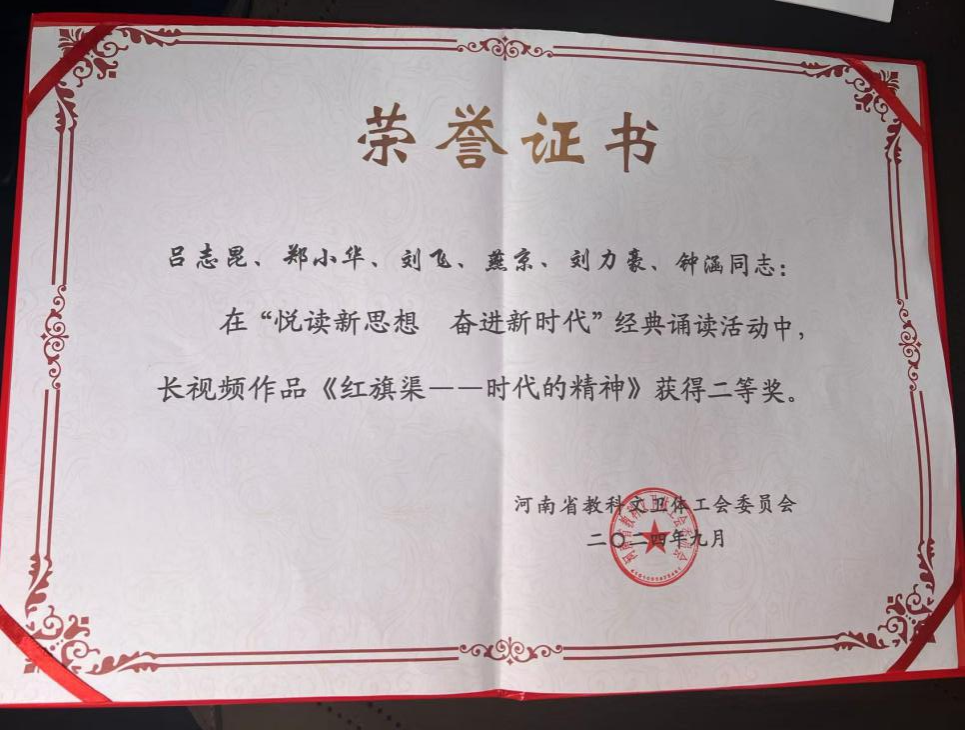 为深入学习贯彻习近平新时代中国特色社会主义思想,深刻领悟党的创新理论的真理力量和实践伟力,持续深化落实省委、省政府关于书香河南建设的重要部署教育引导全省科教文体系统广大职工群众坚定理想信念、提升文化素养,积极投身中国式现代化建设河南实践,很那省科教文卫体工会开展了“悦读新思想 奋进新时代”经典诵读活动。公司播音与主持艺术教研室老师吕志昆、郑小华、刘飞、燕京、刘力豪、钟涵老师积极参与,作品《红旗渠——时代的精神》获得此次诵读活动二等奖。