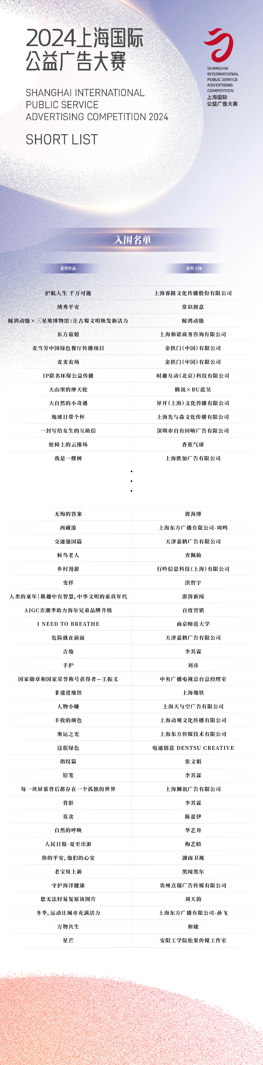 本次上海国际公益广告大赛历时百天,征集到来自全球各地的9306件公益广告佳作。这些作品聚焦对全球议题的探讨、中国传统文化传承及科技创新赋能美好生活等内容,力争打造汇聚全球广告创意人才的平台。组委会邀请了近200位来自政府机构、国内外创意公司、互联网平台、品牌企业、媒体机构、高等院校等多元领域的专家评委对参赛作品进行了初审、终审,最终推选出入围名单。